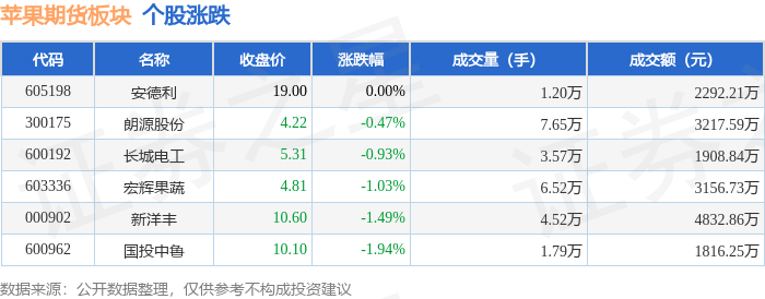 北向资金方面,当日苹果期货板块北向资金持股市值为1.05亿元,增持21.49万元。其中增持最多的是安德利,增持了98.82万元。减持持最多的是新洋丰,减持了77.33万元。苹果期货板块北向资金持股变动明细见下表: