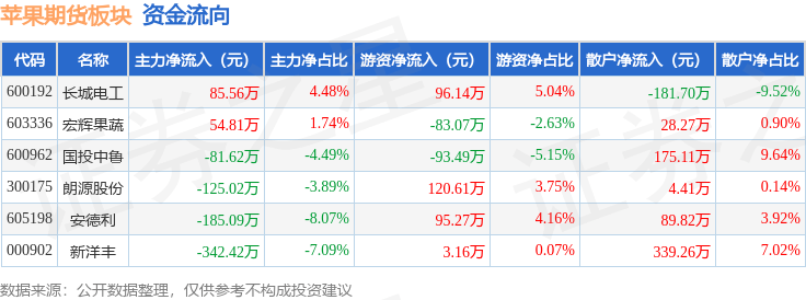 从资金流向上来看,当日苹果期货板块主力资金净流出593.79万元,游资资金净流入138.61万元,散户资金净流入455.18万元。苹果期货板块个股资金流向见下表:
