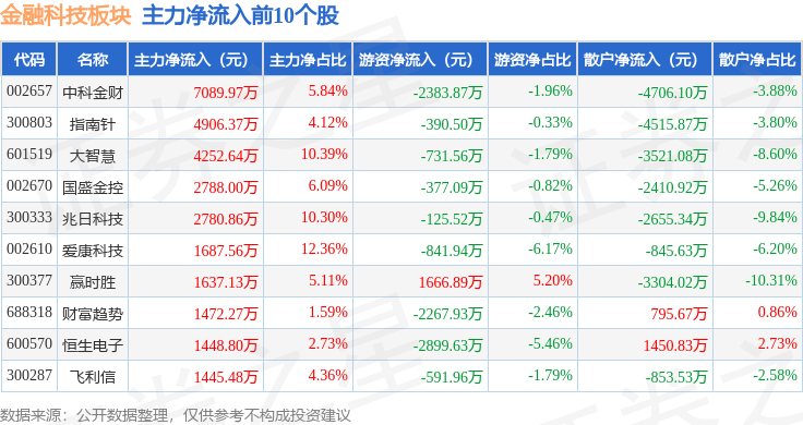 从资金流向上来看,当日金融科技板块主力资金净流出26.37亿元,游资资金净流入2.25亿元,散户资金净流入24.12亿元。金融科技板块个股资金流向见下表: