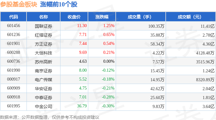 北向资金方面,当日参股基金板块北向资金持股市值为817.42亿元,减持9.32亿元。其中增持最多的是烽火通信,增持了0.1亿元。减持持最多的是中信证券,减持了2.34亿元。参股基金板块北向资金持股变动明细见下表:
