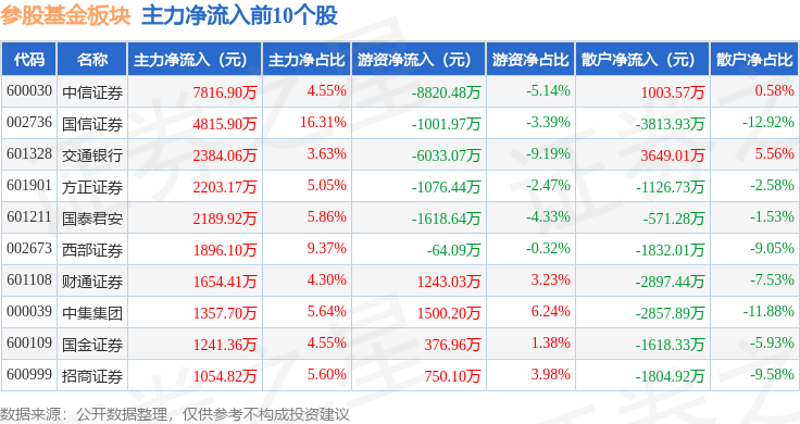 从资金流向上来看,当日参股基金板块主力资金净流出3.83亿元,游资资金净流入7727.04万元,散户资金净流入3.05亿元。参股基金板块个股资金流向见下表: