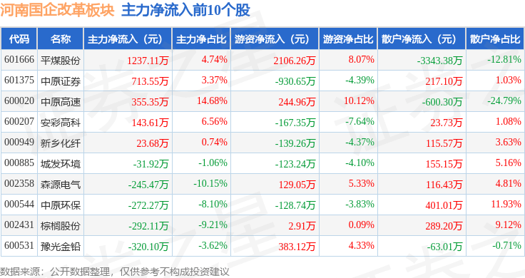 从资金流向上来看,当日河南国企改革板块主力资金净流出1.2亿元,游资资金净流入3999.28万元,散户资金净流入8032.99万元。河南国企改革板块个股资金流向见下表: