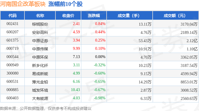 北向资金方面,当日河南国企改革板块北向资金持股市值为28.51亿元,增持0.47亿元。其中增持最多的是神火股份,增持了0.41亿元。减持持最多的是安彩高科,减持了228.47万元。河南国企改革板块北向资金持股变动明细见下表: