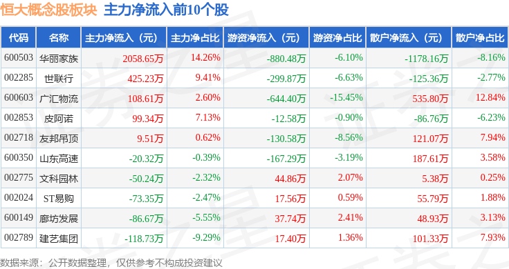 从资金流向上来看,当日恒大概念股板块主力资金净流出1.58亿元,游资资金净流入3944.16万元,散户资金净流入1.19亿元。恒大概念股板块个股资金流向见下表: