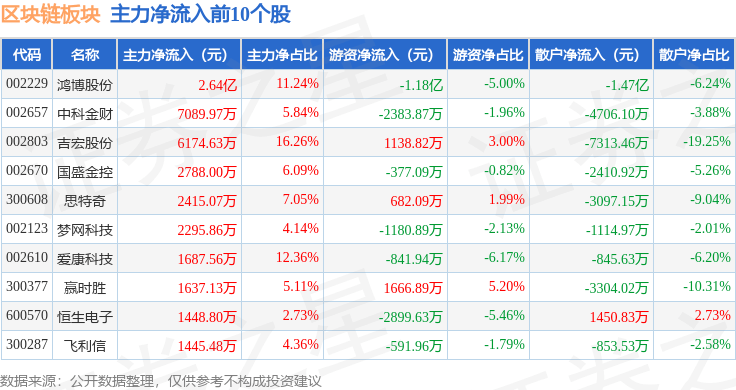 从资金流向上来看,当日区块链板块主力资金净流出30.11亿元,游资资金净流入3.1亿元,散户资金净流入27.01亿元。区块链板块个股资金流向见下表: