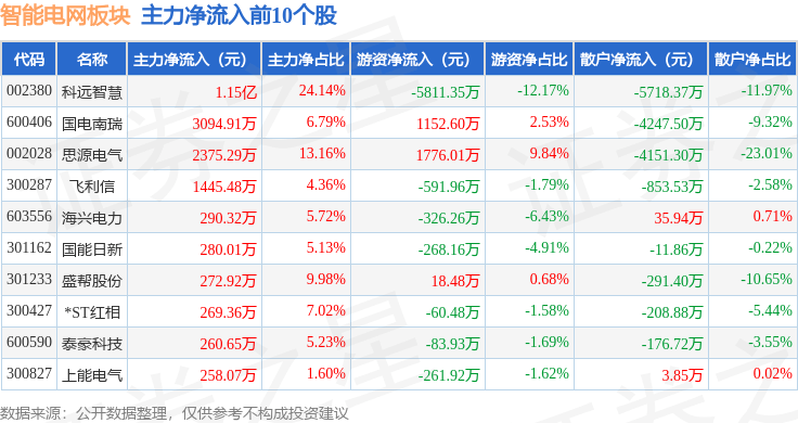 从资金流向上来看,当日智能电网板块主力资金净流出12.22亿元,游资资金净流入1.17亿元,散户资金净流入11.05亿元。智能电网板块个股资金流向见下表: