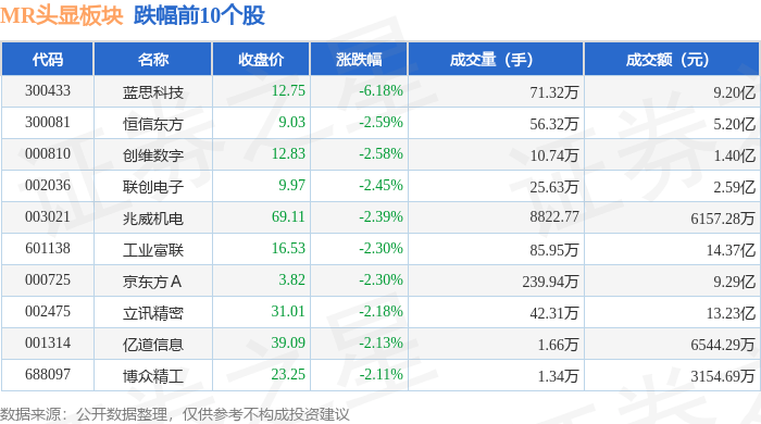 证券之星消息,10月19日MR头显板块较上一交易日下跌2.3%,蓝思科技领跌。当日上证指数报收于3005.39,下跌1.74%。深证成指报收于9655.09,下跌1.65%。MR头显板块个股涨跌见下表: