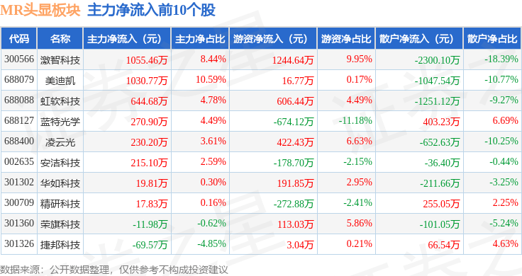 从资金流向上来看,当日MR头显板块主力资金净流出6.77亿元,游资资金净流入4166.52万元,散户资金净流入6.35亿元。MR头显板块个股资金流向见下表:
