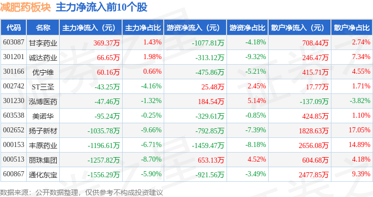 从资金流向上来看,当日减肥药板块主力资金净流出13.89亿元,游资资金净流入1.57亿元,散户资金净流入12.33亿元。减肥药板块个股资金流向见下表: