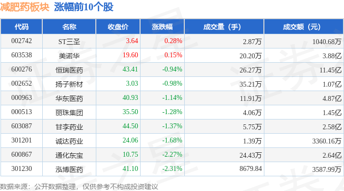 北向资金方面,当日减肥药板块北向资金持股市值为208.03亿元,增持0.52亿元。其中增持最多的是众生药业,增持了0.71亿元。减持持最多的是恒瑞医药,减持了1.09亿元。减肥药板块北向资金持股变动明细见下表: