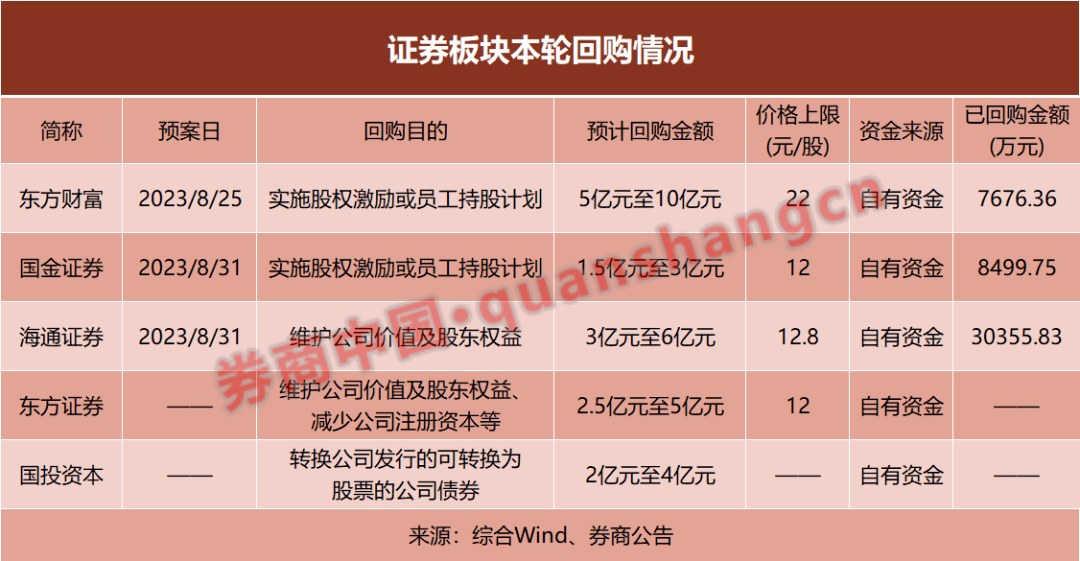 此前的8月下旬,国金证券、东方财富、海通证券已率先出手回购。