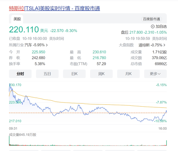 【CNMO新闻】日前,特斯拉公布财报,第三季度归属于普通股股东的净利润为18.53亿美元,较上年同期的32.92亿美元大幅下滑44%。财报公布后,特斯拉本周三股价下跌4.78%,报收于242.68美元/股,市值一夜之间蒸发超过386亿美元,约合人民币2824亿元。10月20日,CNMO注意到,截至周四收盘,特斯拉再跌,跌超9%,市值蒸发716.37亿美元(约合人民币5236.28亿元)。消息面上,特斯拉近期交出四年来赚钱能力最差的财报,三季度公司毛利率跌破18%。