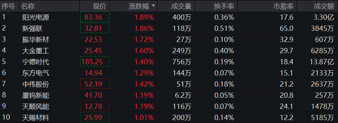 新能源ETF易方达(516090)紧密跟踪中证新能源指数,截至2023年10月20日9:36,指数成份股中,阳光电源领涨1.89%,新强联上涨1.86%,振华新材上涨1.72%,大金重工、宁德时代等个股跟涨超1%。