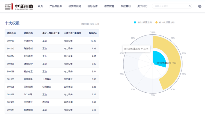 截至2023年10月19日,该指数的前十大权重股包括宁德时代、隆基绿能、阳光电源、通威股份、特变电工等,前十大权重股合计占比约为44.03%。(数据来源:中证指数公司,指数成份股不代表个股推荐)