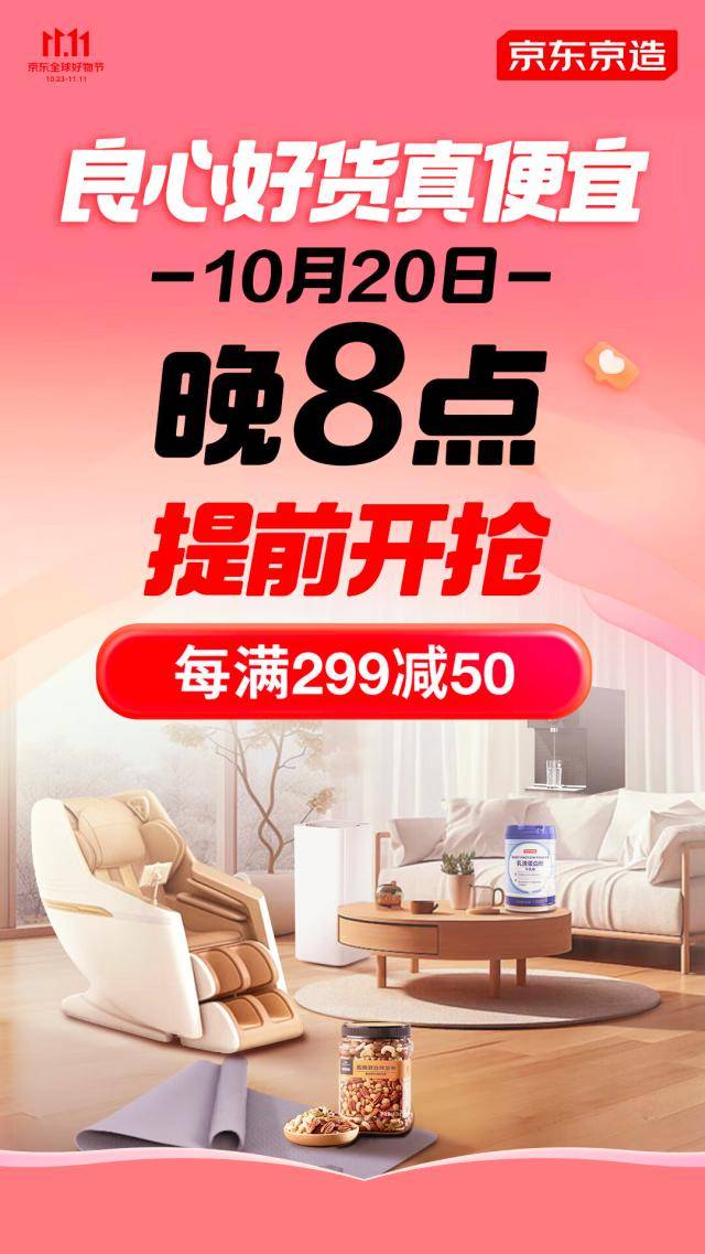 作为京东自有品牌,京东京造聚焦宅家、美食、穿搭、户外运动、宠物五大场景,在11.11期间推出“每299元减50元”活动,每天可领60元补贴,部分商品还有2件9折、3件8折优惠,人体工学椅、乳清蛋白粉、穿山甲冲锋衣等众多爆款好物大方来袭,10月20日晚8点提前开抢!
