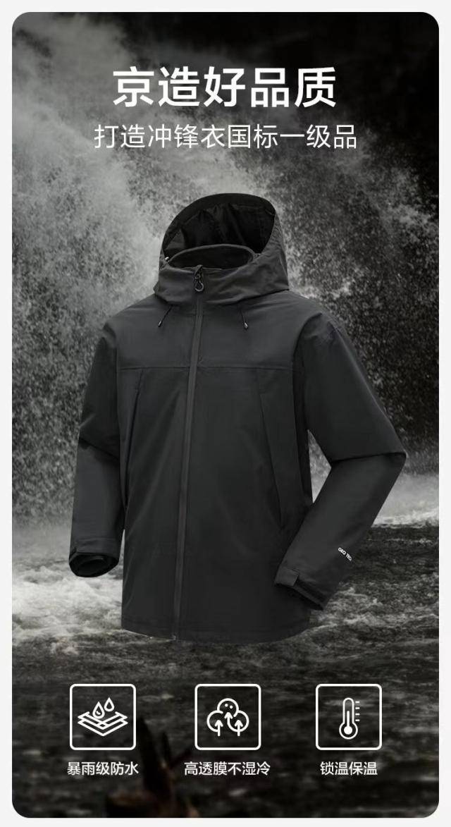 为满足“山系青年”的全场景户外需求,京东京造 “穿山甲三合一冲锋衣”采用德国ISPO获奖科技面料GEO TECH,防风、防水、透湿、耐磨等性能卓越,各项指数高于冲锋衣国标一级品标准,不仅功能全面,还可一衣三穿,满足“全季节”户外运动需求。