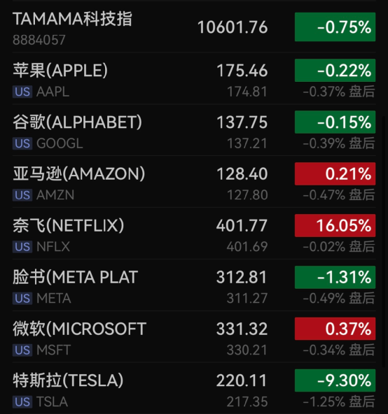 科技股涨跌不一,万得美国TAMAMA科技指数跌0.75%,特斯拉跌9.3%,脸书跌1.31%,苹果跌0.22%,亚马逊涨0.21%,奈飞涨16.05%,谷歌跌0.15%,微软涨0.37%。
