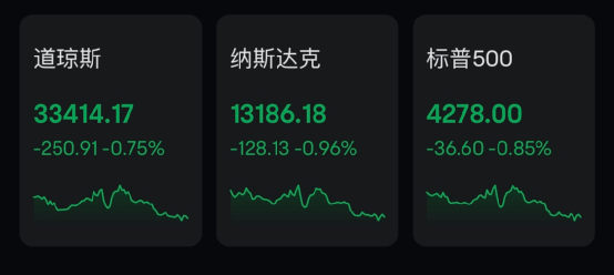 美国三大股指集体收跌,道指跌0.75%报33414.17点,标普500指数跌0.85%报4278点,纳指跌0.96%报13186.18点。