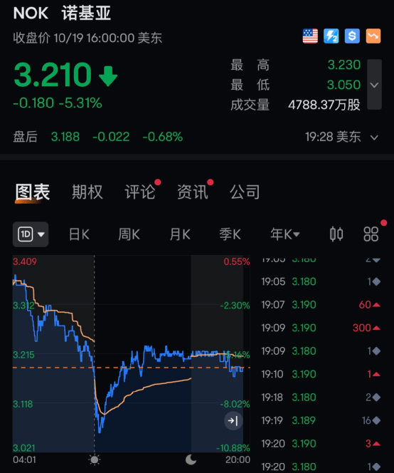 周四收盘,诺基亚股价跌5.31%,报3.2美元/股。