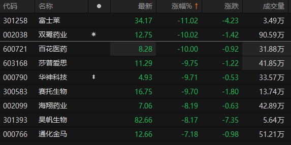 上证报中国证券网讯 10月20日早盘,申万一级板块中,医药生物板块震荡走低。截至11时14分,双鹭药业、百花医药跌停,富士莱跌超11%,莎普爱思、华神科技、赛托生物跌超9%。