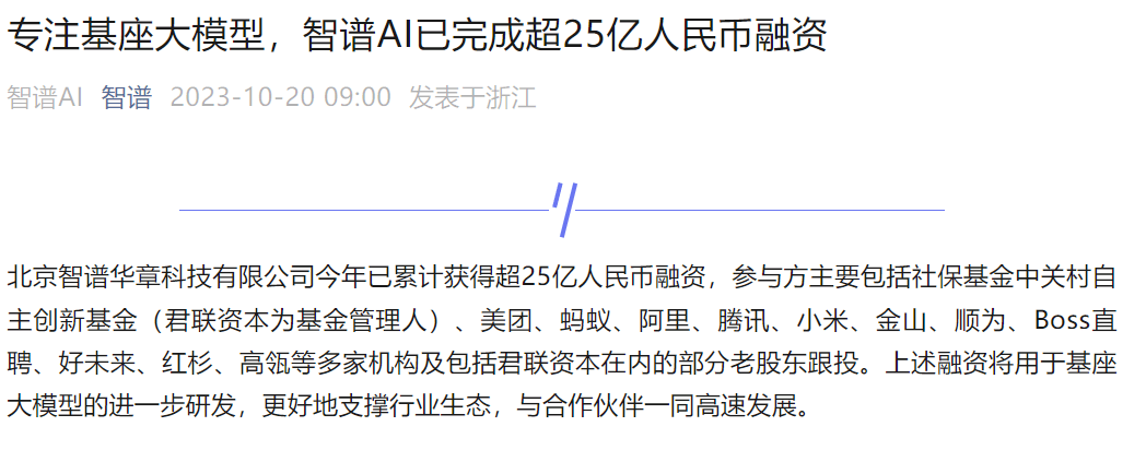 鞭牛士 10月20日消息,今日智谱公众号发文称,智谱AI已完成超25亿人民币融资,其中参与方主要包括社保基金中关村自主创新基金(君联资本为基金管理人)、美团、蚂蚁、阿里、腾讯、小米、金山、顺为、Boss直聘、好未来、红杉、高瓴等多家机构及包括君联资本在内的部分老股东跟投。