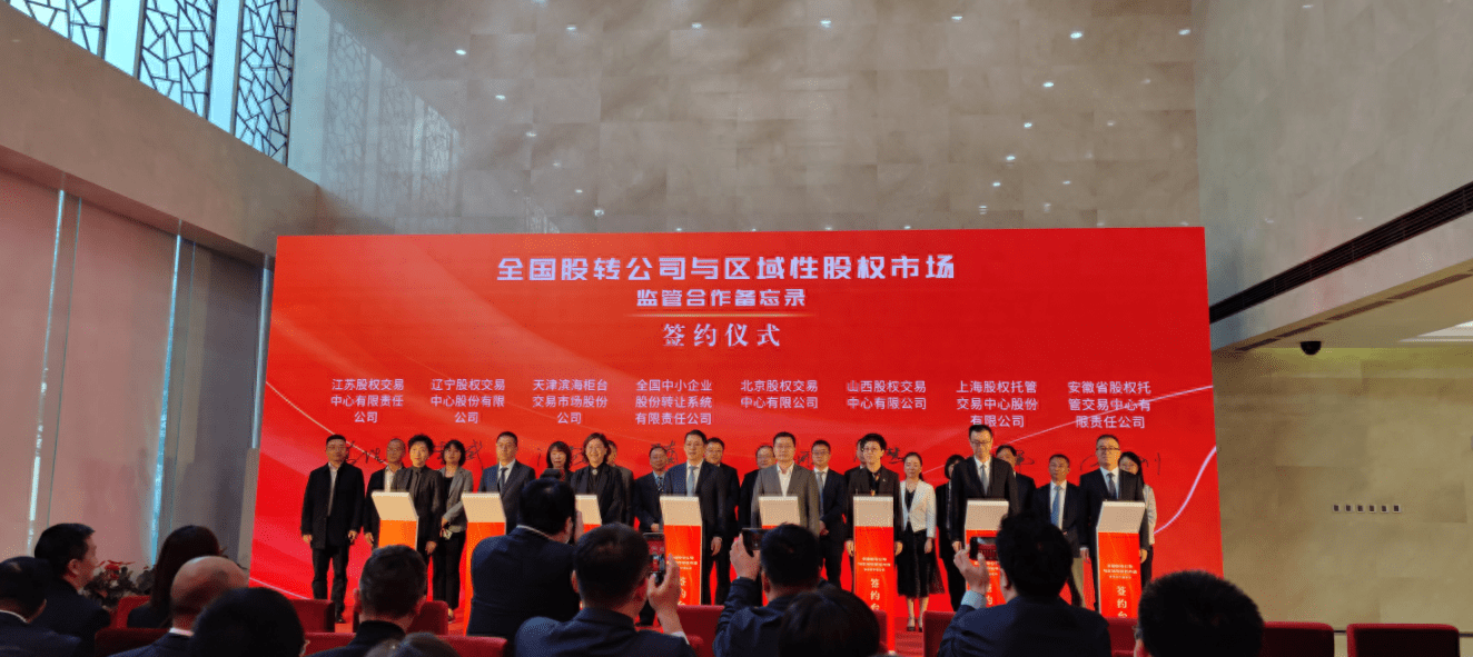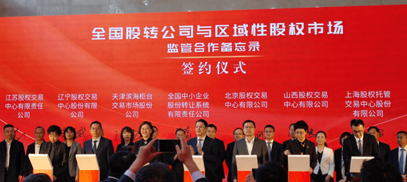 签约仪式上,全国股转公司与浙江、宁波、重庆、武汉等4家区域性股权市场签署绿色通道、公示审核监管合作备忘录,与北京、天津、山西、辽宁、上海、江苏、安徽、江西、齐鲁、中原、湖南、广东、新疆、青岛等14家区域性股权市场签署绿色通道监管合作备忘录。