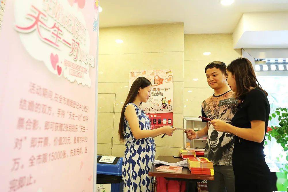 2019年8月7日,重庆,七夕节,沙坪坝区民政局婚姻登记处,登记结婚的每对新人均可免费领取面值10元的“天生一对”即开福利彩票2张,最高可中奖20万。