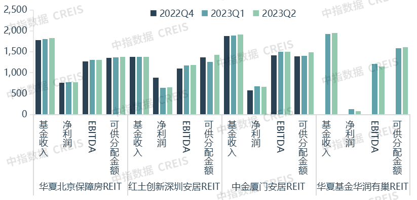 从核心财务指标来看,保租房公募REITs运营业绩总体呈现稳健态势。据最新披露数据显示,2023年二季度,华夏北京保障房REIT实现收入1827万元,环比增长1.32%,可供分配金额1380万元,环比增长0.61%;红土创新深圳安居REIT实现收入1376万元,环比微降0.10%,可供分配金额1433万元,环比增长13.60%;中金厦门安居REIT实现收入1919万元,环比增长1.25%,可供分配金额1488万元,环比增长6.15%;华夏基金华润有巢REIT实现收入1946万元,环比增长1.00%,可供分配金额1616万元,环比增长1.56%。