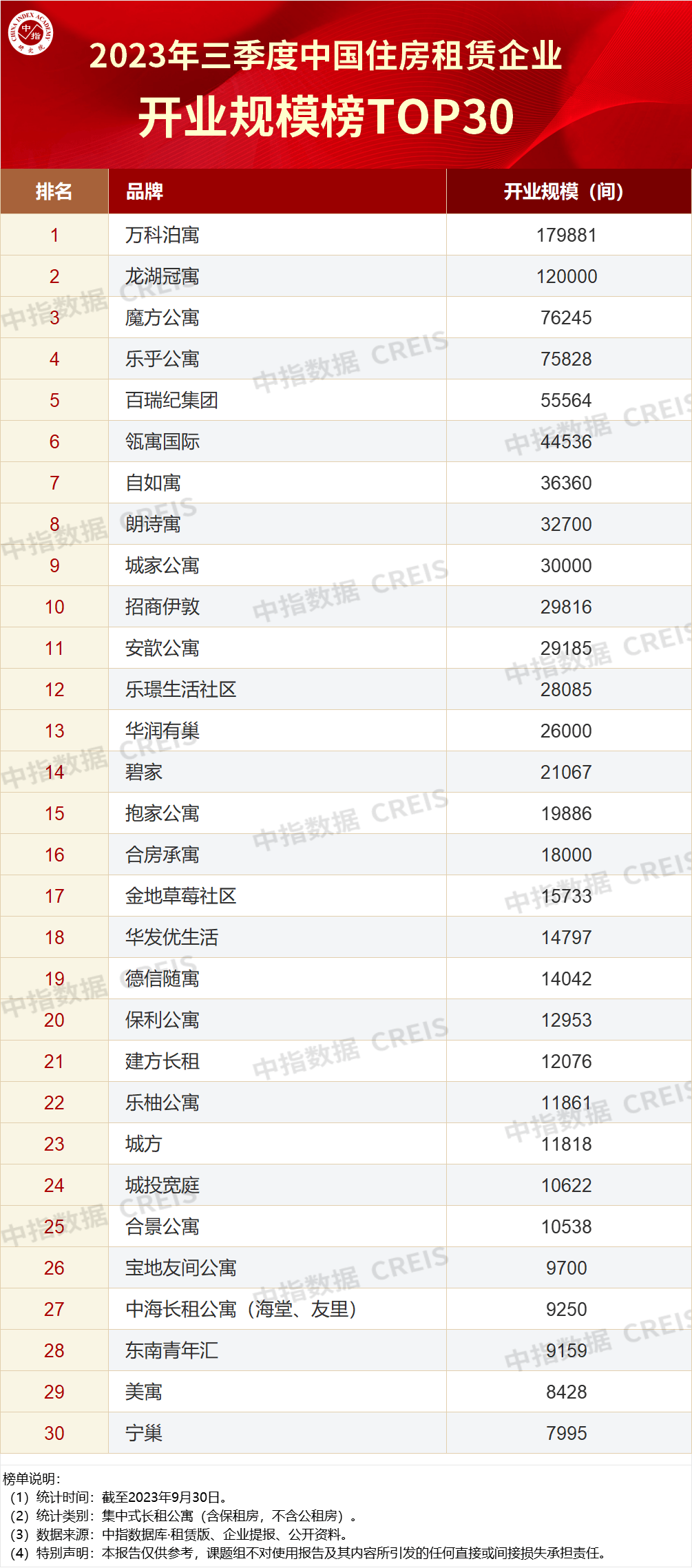 据中指研究院统计,2023年三季度,TOP30集中式长租公寓企业累计开业房源量达98.2万间,较二季度增加6.6万间。其中,TOP5企业累计开业规模达50.8万间,较二季度增加1.5万间,占TOP30总规模比重为51.7%,占比较二季度略有下降。三季度,开业规模TOP30入榜门槛为7995间,较二季度增加约2800间。