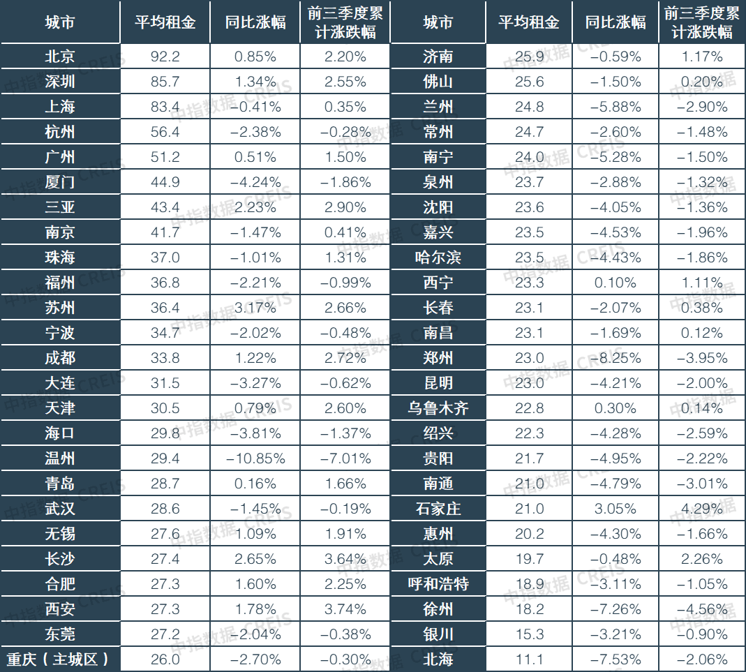 表:2023年9月50城住宅租赁价格指数(元/平方米/月)