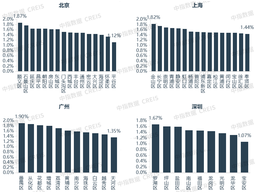 3.租金房价比:一线城市各辖区租金房价比均低于2%