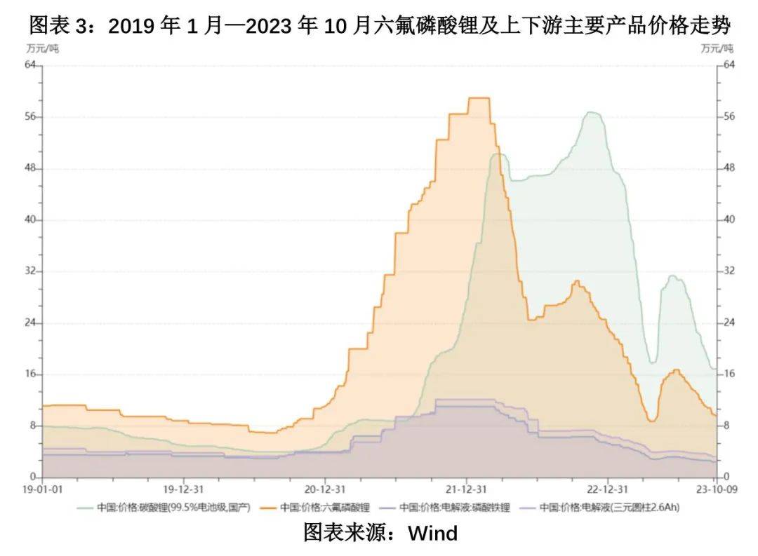如图表3所示,据Wind数据,2022年,碳酸锂价格处于高位,但六氟磷酸锂价格下滑明显。