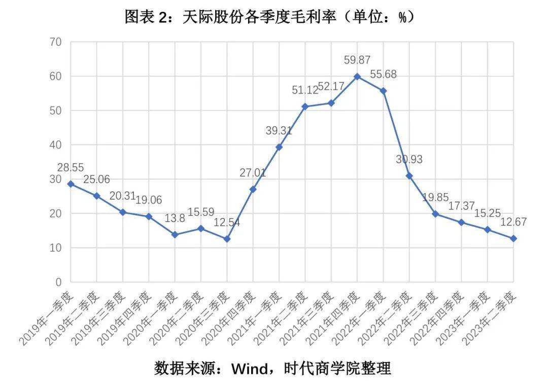 在六氟磷酸锂供需关系变动的影响下,天际股份的毛利率也出现下跌。据Wind数据,如图表2所示,分季度看,2019年以来,天际股份毛利率于2021年四季度达到最高值59.87%,随后连续下跌,到2023年二季度,仅剩12.67%,已逼近2020年三季度的低位12.54%。