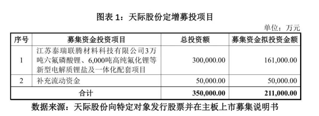 2023年3月4日,天际股份发布定增说明书(注册稿),计划募资21.10亿元,其中5亿元用于补充流动资金,16.10亿元用于建设“江苏泰瑞联腾材料科技有限公司3万吨六氟磷酸锂、6000吨高纯氟化锂等新型电解质锂盐及一体化配套项目”(以下简称“3万吨六氟磷酸锂项目”)。