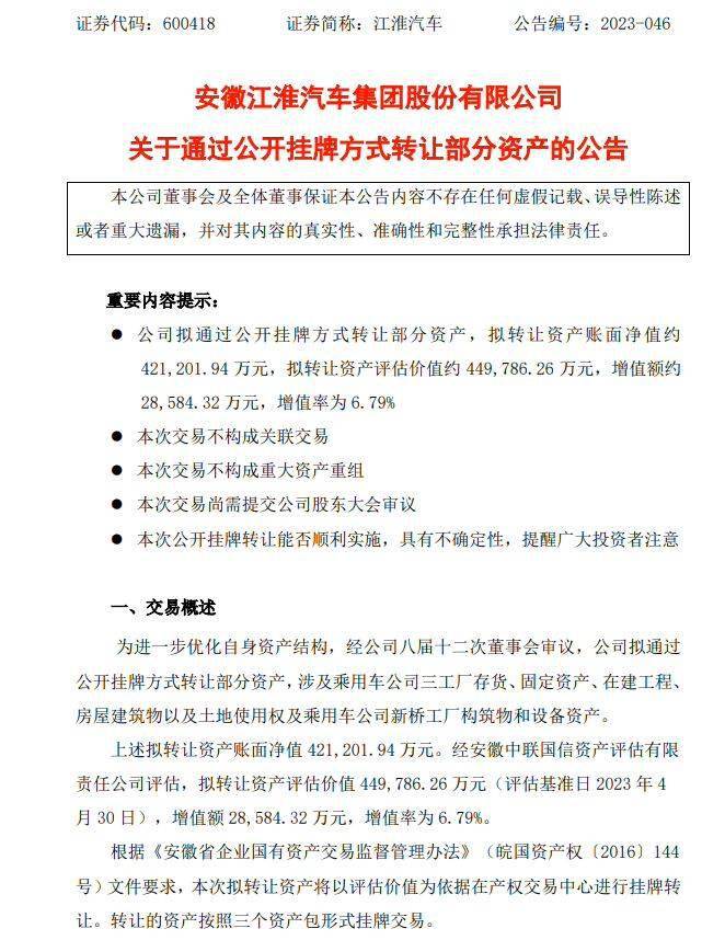 DoNews10月20日消息,江淮汽车日前发布公告称,公司拟通过公开挂牌的方式转让部分资产,涉及乘用车公司三工厂存货、固定资产、在建工程、房屋建筑物及土地使用权、乘用车公司新桥工厂构筑物和设备资产,拟挂牌价为 44.98 亿元。