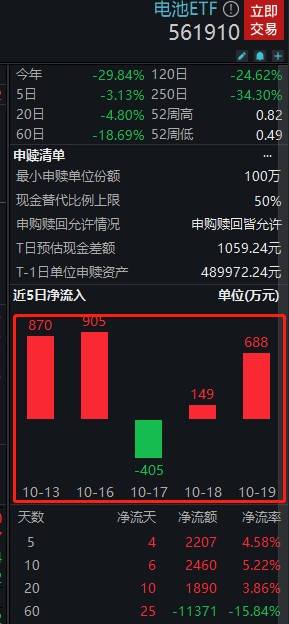 2023年10月20日,锂电板块早盘垂直拉升。截至13时15分,电池ETF(561910)涨幅回落至1.02%,自前一日创新低后放量反弹,幅度达3.26%。成分股恩捷股份涨停封板,鹏辉能源、科士达、天华新能、中国宝安涨幅居前。交投活跃,换手率达5.02%,成交额超2400万。资金逢低布局意图明显,该基金年内份额扩容超130%。