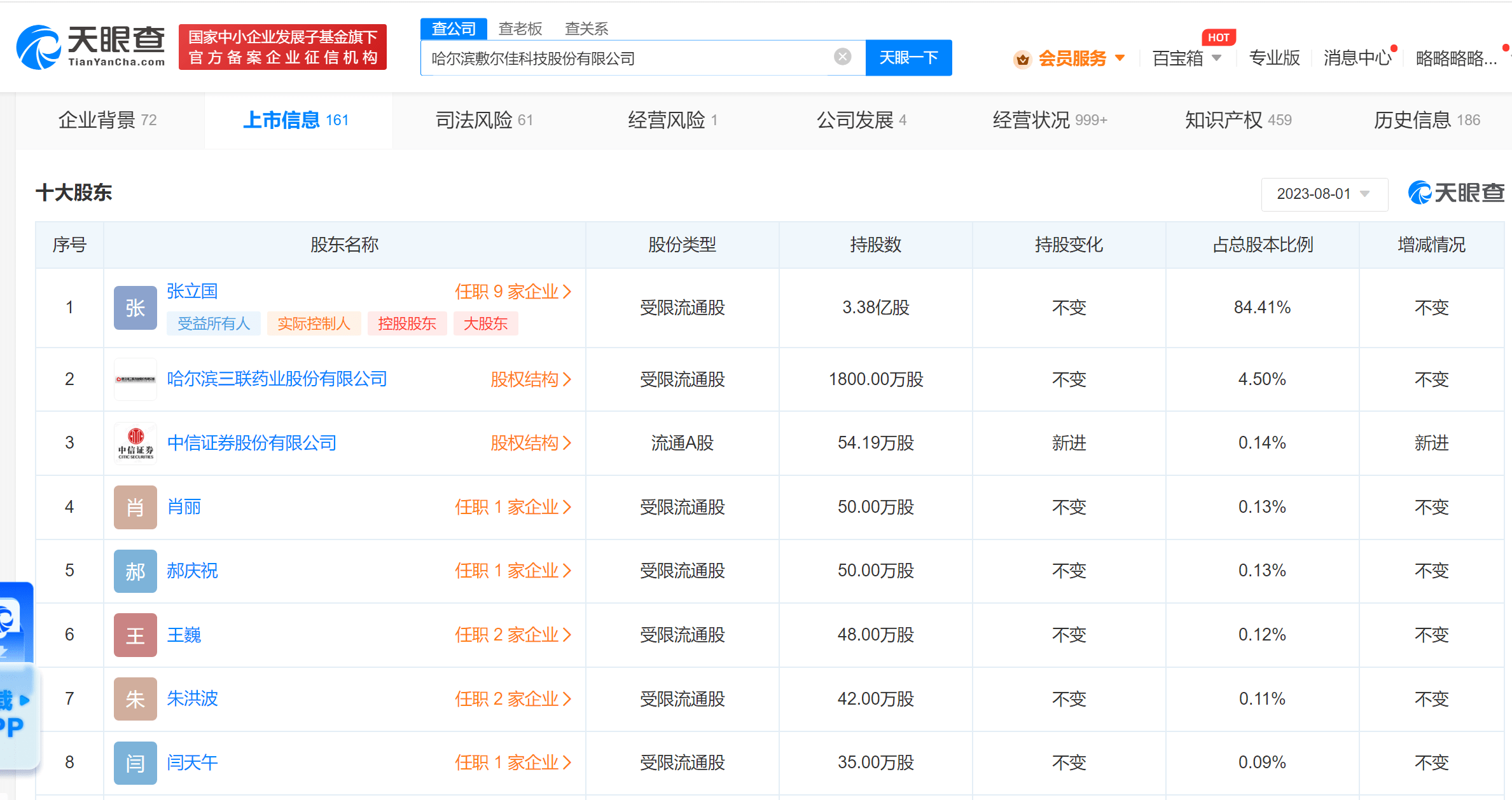 哈尔滨敷尔佳科技股份有限公司成立于2017年11月,于今年8月在A股上市,其法定代表人为张立国,经营范围含医学研究和试验发展,化妆品生产、批发、零售,个人卫生用品销售等,由张立国、哈三联(002900)、中信证券(600030)等共同持股。