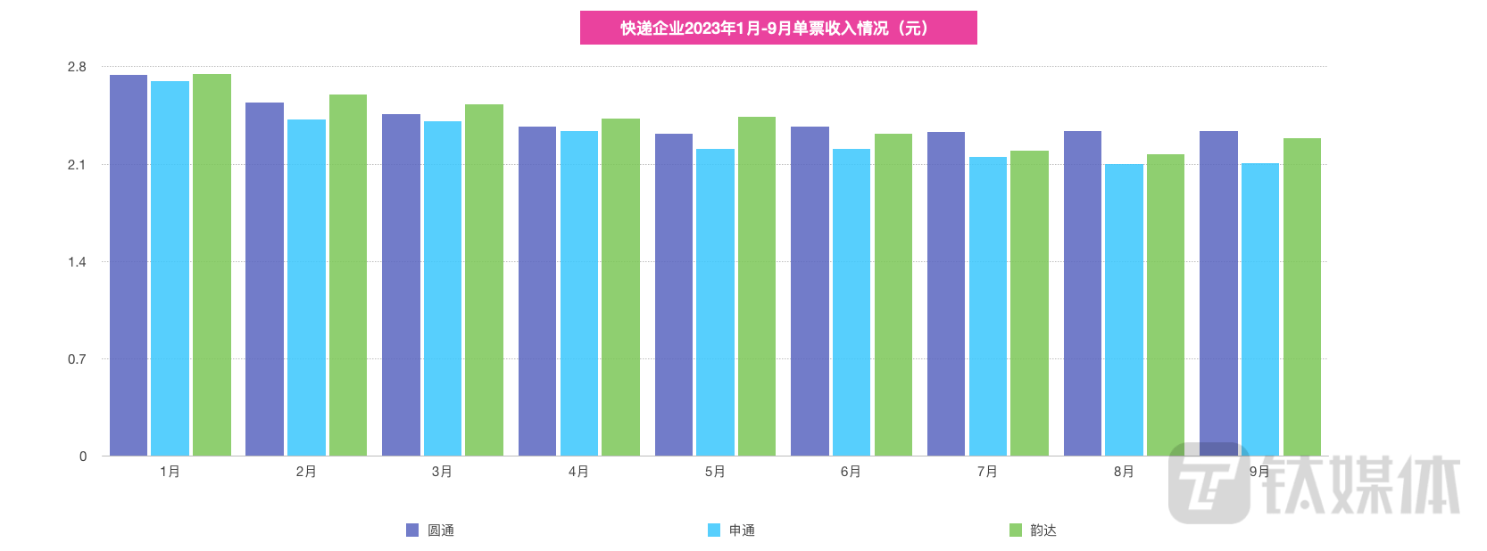 具体来看,通达系方面,圆通、韵达、申通今年9月单票价格分别为2.34元、2.29元、2.11元,同比分别下降7.32%、12.93%、13.52%,顺丰9月速运物流业务单票收入为17.21元,同比减少4.12%。其中,韵达和顺丰9月单票价格同比下降幅度较8月明显收窄。