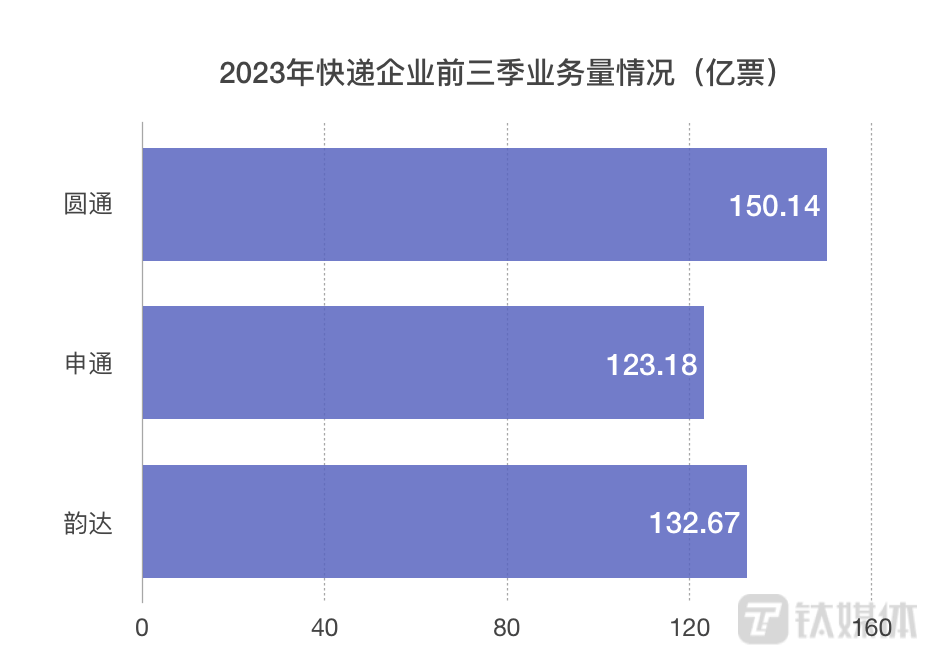 从前三季度的情况来看,钛媒体APP根据国家邮政管理局公布的今年三季度单季快递增量48.4亿件计算,今年前三季快递业务总量约931.5亿件,圆通、韵达、申通的市占率约为16.1%、14.2%,13.2%,与今年上半年的数据相比几无变动。(本文首发于钛媒体APP,作者|张孙明烁)