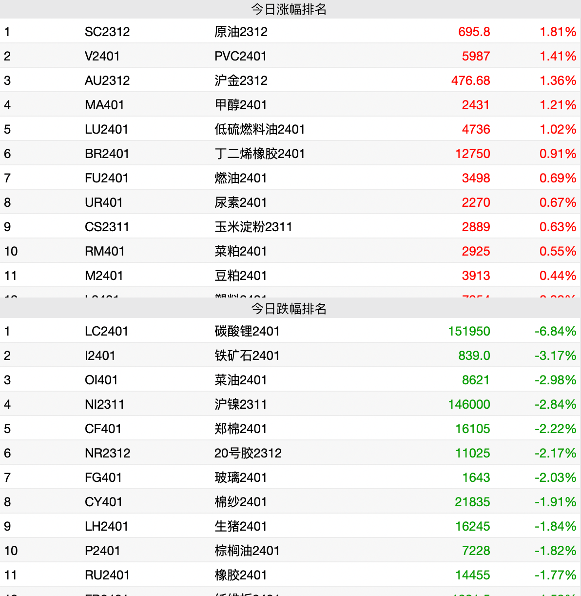 10月20日消息,商品期货收盘多数下跌,碳酸锂跌近7%,铁矿石跌超3%,棉花、NR等跌逾2%,豆油、氧化铝等跌超1%,沪铜、螺纹钢等小幅下跌;原油、沪金等涨超1%,豆粕、菜粕等小幅上涨。