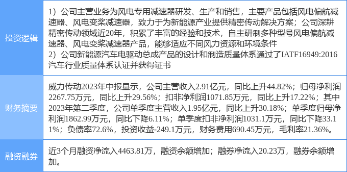 证券之星消息,威力传动涨停收盘,收盘价86.69元。该股于9点41分涨停,2次打开涨停,截止收盘封单资金为1984.33万元,占其流通市值1.33%。
