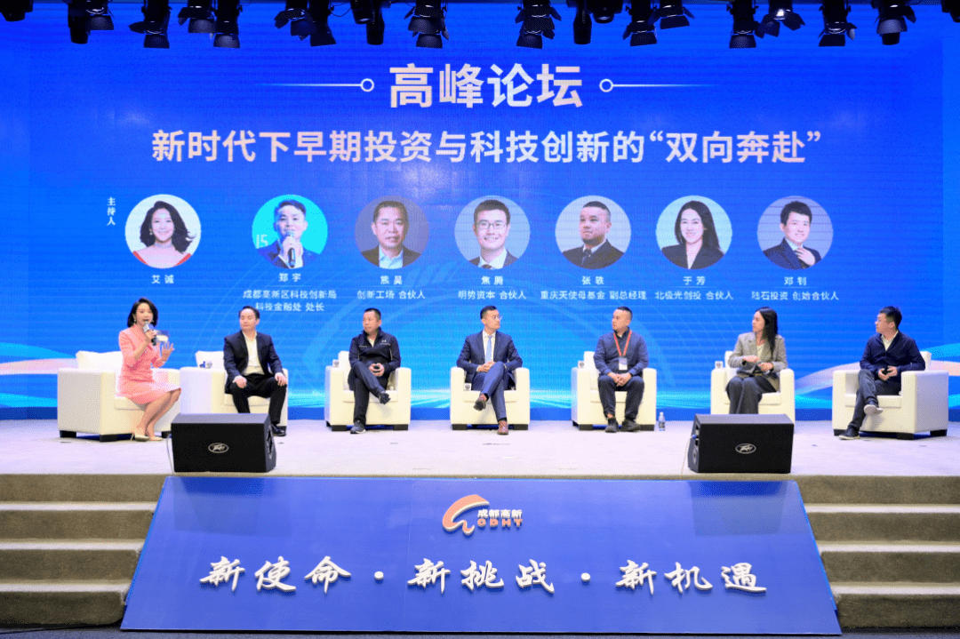 在上午进行的新时代下早期投资与科技创新的“双向奔赴”高峰论坛中,艾诚作为论坛主持人,与来自成都高新区科技创新局相关领导、创新工场合伙人熊昊、明势资本合伙人焦腾、重庆天使母基金副总经理张轶、北极光创投合伙人于芳、陆石投资创始合伙人邓钊共同围绕主题“新时代”、“早期投资”“科技创新”和“双向奔赴”等关键词展开探讨。