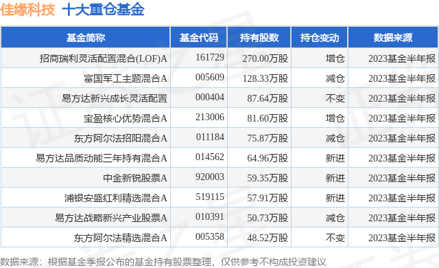 根据2023基金半年报公募基金重仓股数据,重仓该股的公募基金共161家,其中持有数量最多的公募基金为招商瑞利灵活配置混合(LOF)A。招商瑞利灵活配置混合(LOF)A目前规模为32.98亿元,最新净值2.0902(10月19日),较上一交易日下跌1.2%,近一年下跌3.39%。该公募基金现任基金经理为陆文凯。陆文凯在任的基金产品包括:招商产业升级1年持有期混合A,管理时间为2023年5月29日至今,期间收益率为nan%。