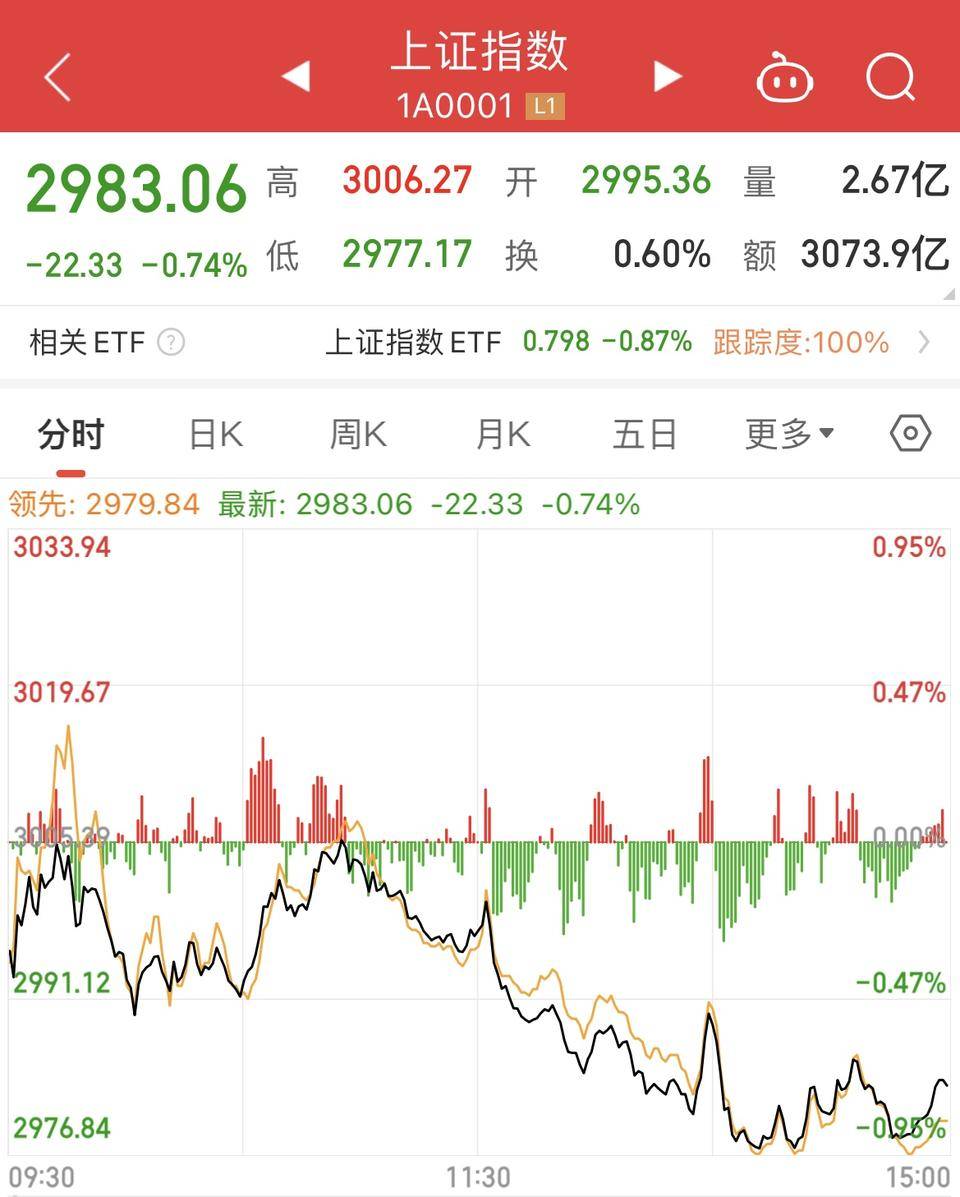 午后开盘,三大股指均大幅下跌,沪指再未站上3000点。最终收盘,沪指跌0.74%,报2983.06点,深证成指跌0.88%,报9570.36点,创业板指跌0.88%,报1896.95点,整个市场共有3695只个股收跌,1350只收涨。北向资金全天净卖出16.46亿元,连续6日净卖出;其中沪股通净买入6.37亿元,深股通净卖出22.83亿元。本周北向资金累计减仓逾240亿元。