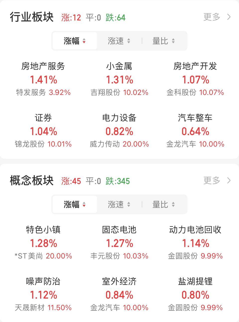 板块方面,房地产领涨,金科股份、华丽家族、荣盛发展、ST世茂涨停;小金属涨幅居前,吉翔股份、江特电机两天两板;证券、新能源、汽车整车板块涨幅也较靠前,新能源威力传动20cm涨停,中恒电气、丰元股份、白云电器、大金重工、恩捷股份、金龙羽涨停。通信设备、半导体及元件、计算机设备、通信服务等跌幅居前。