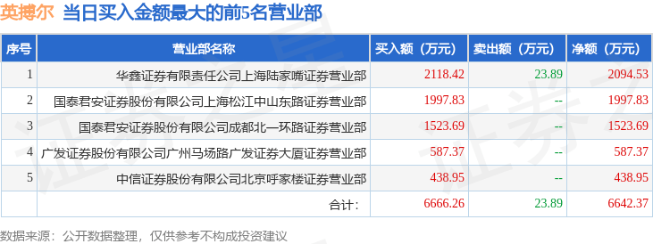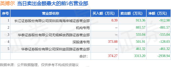 沪深交易所2023年10月20日公布的交易公开信息显示,英搏尔(300681)因日涨幅达到15%的前5只证券登上龙虎榜。此次是近5个交易日内第1次上榜。