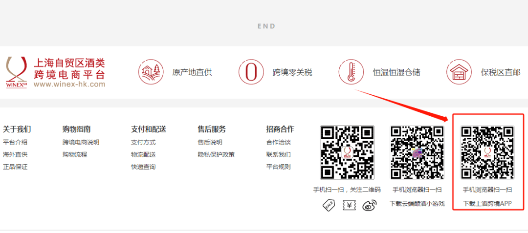 ①登录上海自贸区酒类跨境电商平台(https://www.winex-hk.com),页面下拉到最底部找到上酒跨境App下载二维码。