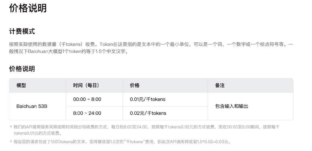 如今的商业化,集中在了Baichuan2-53B,官网显示,该模型的API调取采用了分时段收费标准。0:00-8:00收费为0.01元/千tokens,8:00-24:00收费为0.02元/千token,相比较之下,白天的收费价格要高于晚上。