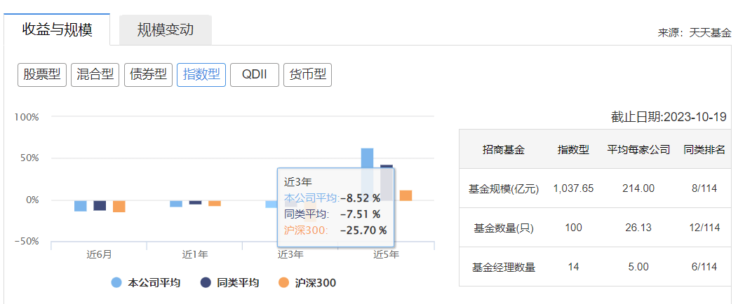 比较意外的是,招商基金指数型基金近3年平均亏损8.52%,同类平均亏损7.51%,跑输同行1.01%。而这一块,恰恰是招商基金自培基金经理的领地。