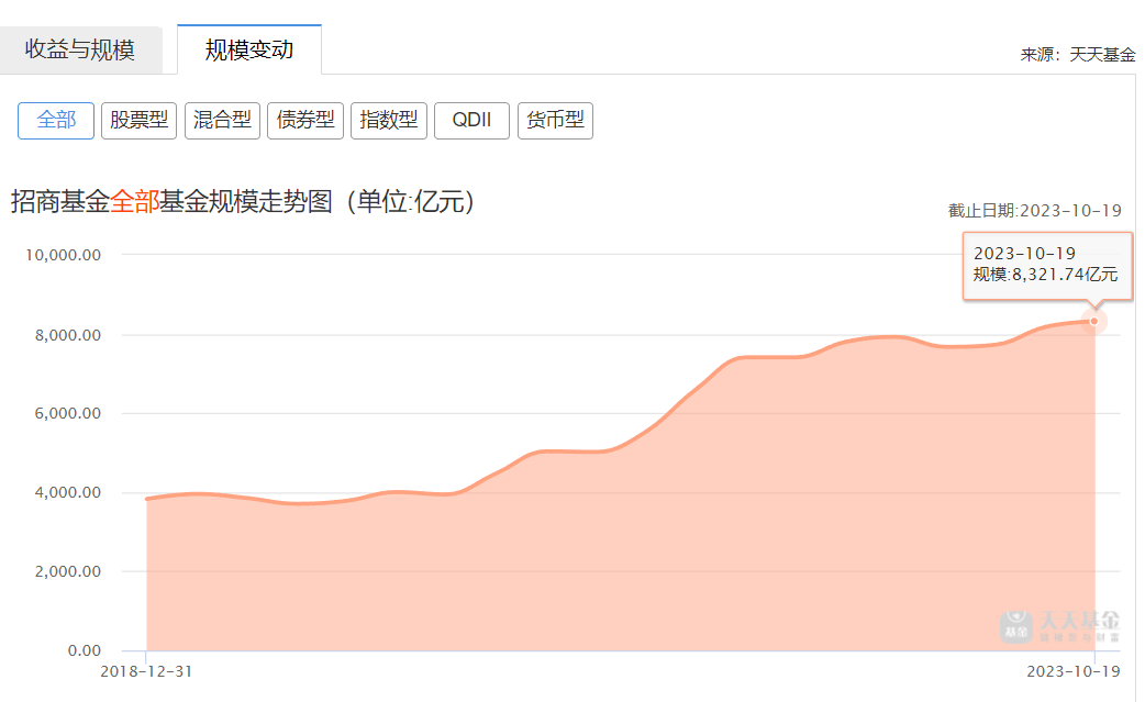 目前,以公募管理规模而言,银行系基金中招商基金居于首位。截至2023年10月19日,招商基金在管规模8321.74亿。其中非货币债券基金2127.27亿,占比25.56%。总体而言,还是货币债券基金占比偏高,这也是银行系基金的共同特点。